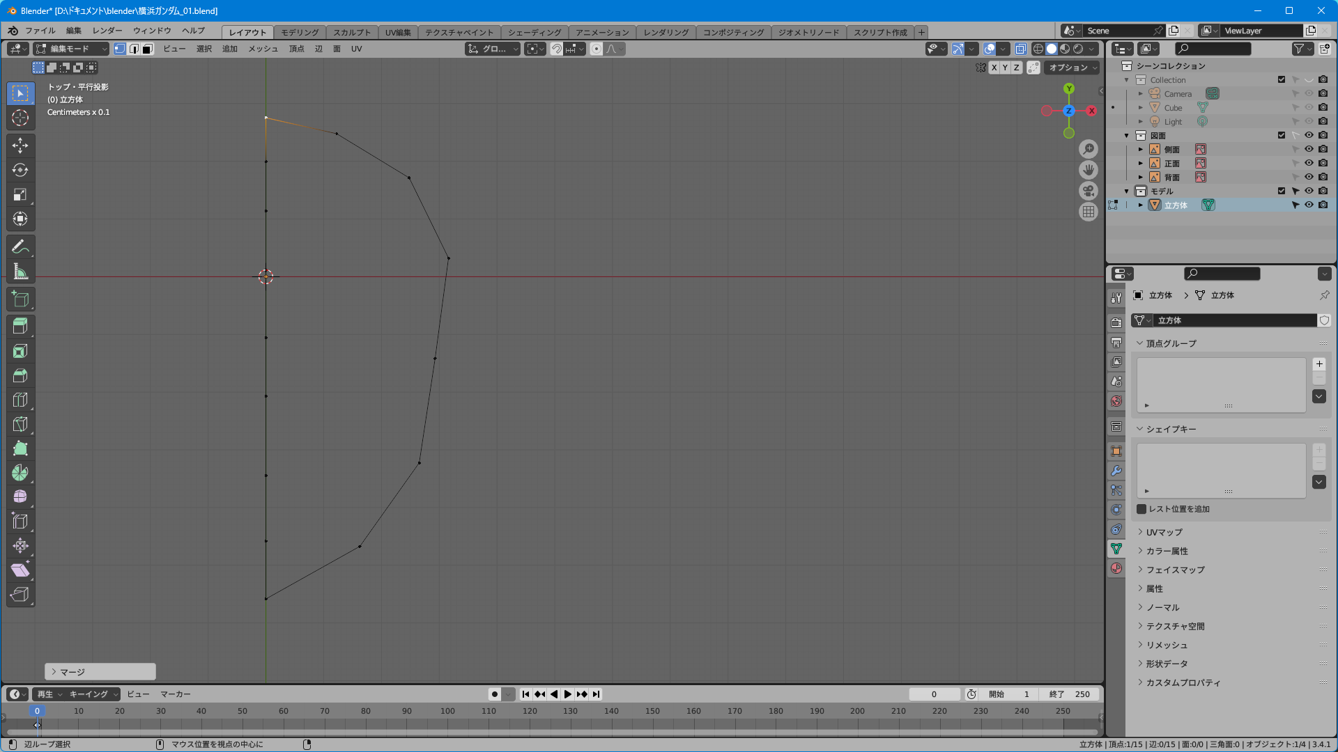 これまでの行程でXYZ3方向の輪郭を描画することが出来た。最終工程一歩手前まで頂点修正地獄が継続するのでこの段階ではだいたいでよい。