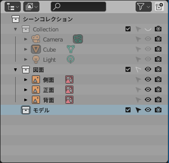 モデリングを始める前にデフォルトのコレクション「Collection」を非表示にして新規に「モデル」コレクションを追加して選択しておく。追加されたオブジェクトは最後に選択したコレクションに追加される。うっかり非表示にした「Collection」や選択不可にした「図面」を最後に選択した状態でオブジェクトの追加をするとそのコレクションに追加され、追加したオブジェクトが見えない、選択できない、といった状態になるので気をつけよう。