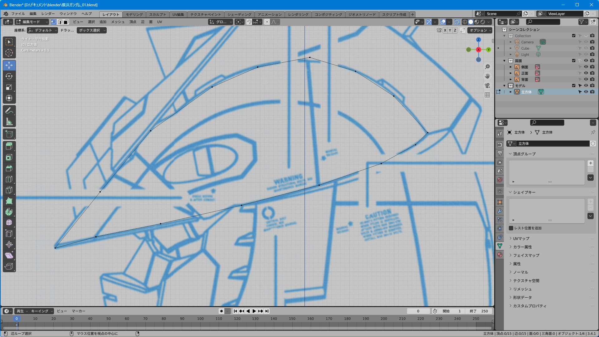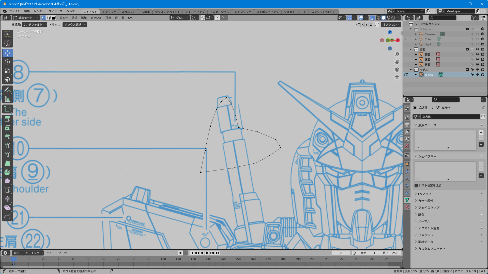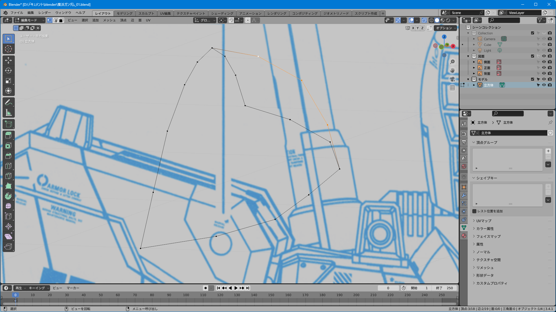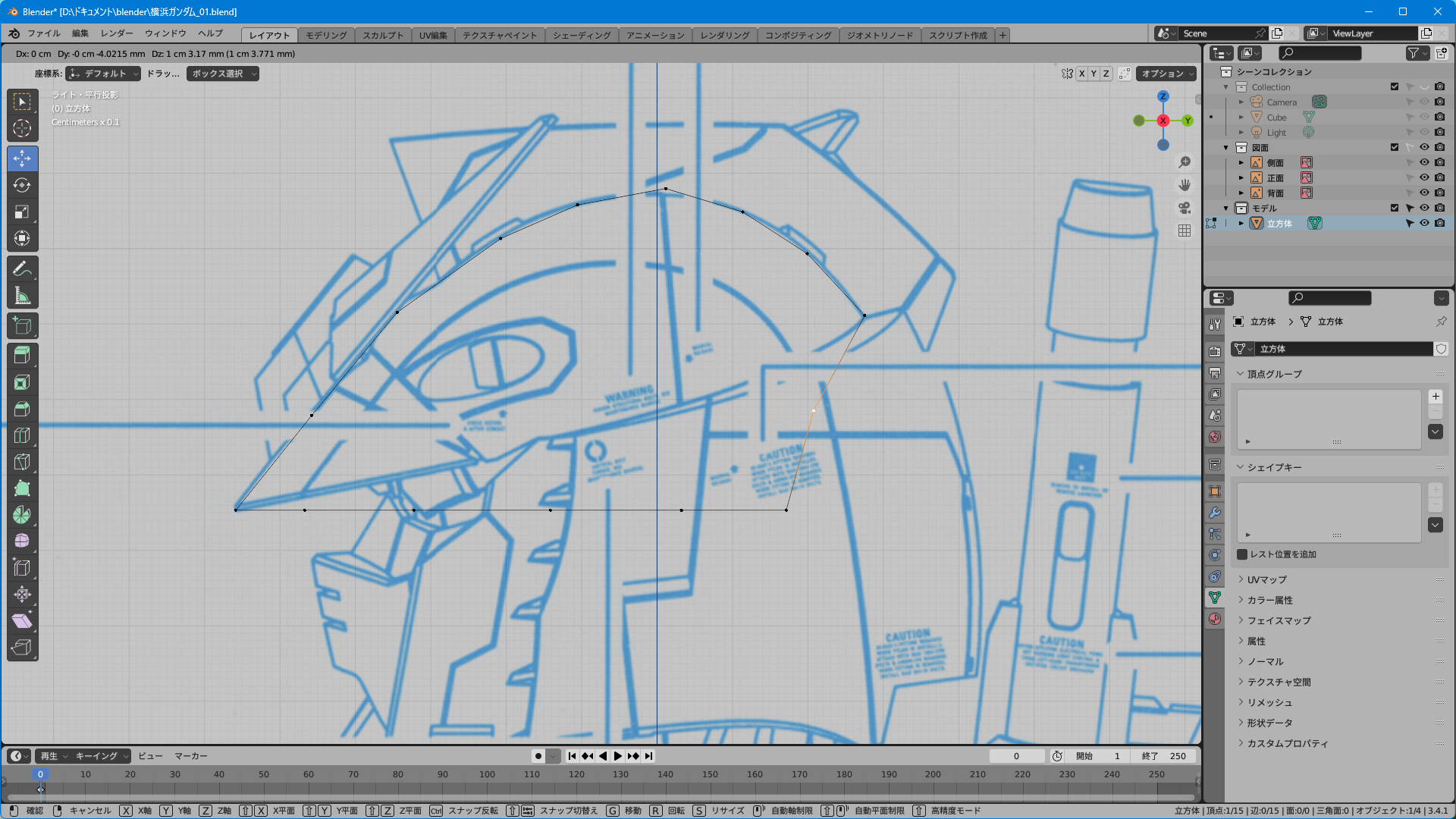 取説のスキャンのみだと上面図がないのでプラモやイラストを参考に頑張って逆ぴちょんちゃんっぽく頂点を追加する。