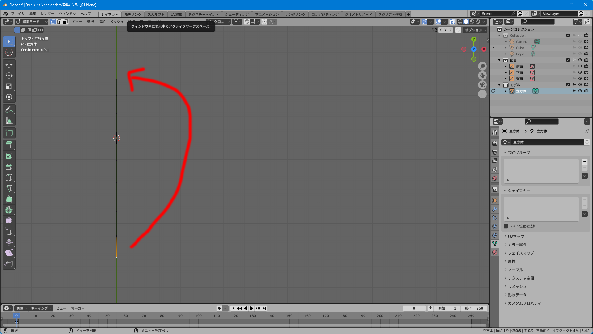 テンキーでない「1」を押して頂点選択モードにする。描画準備完了。