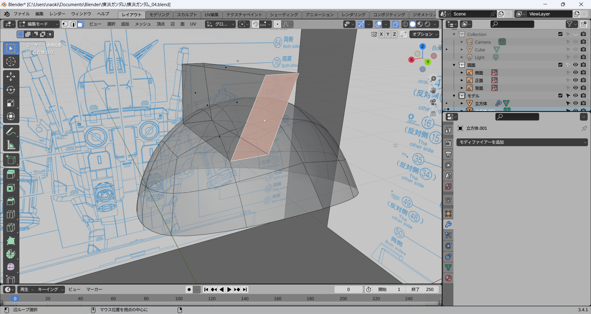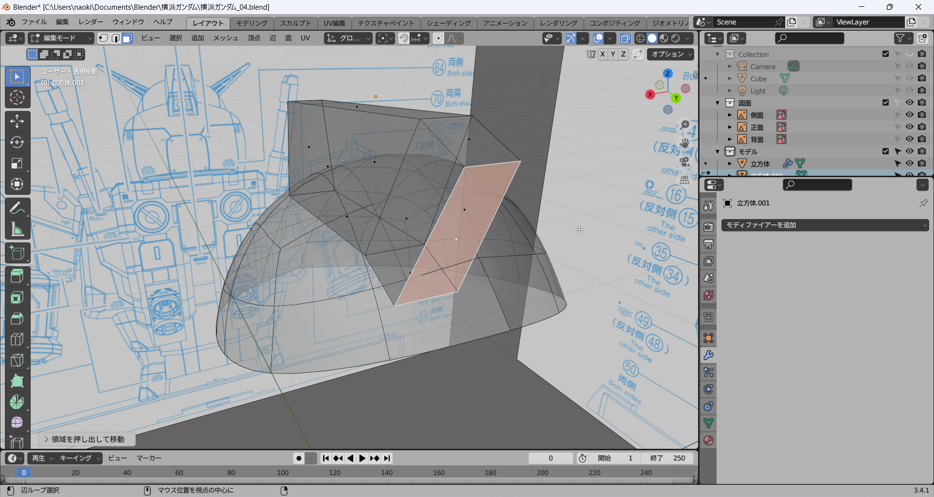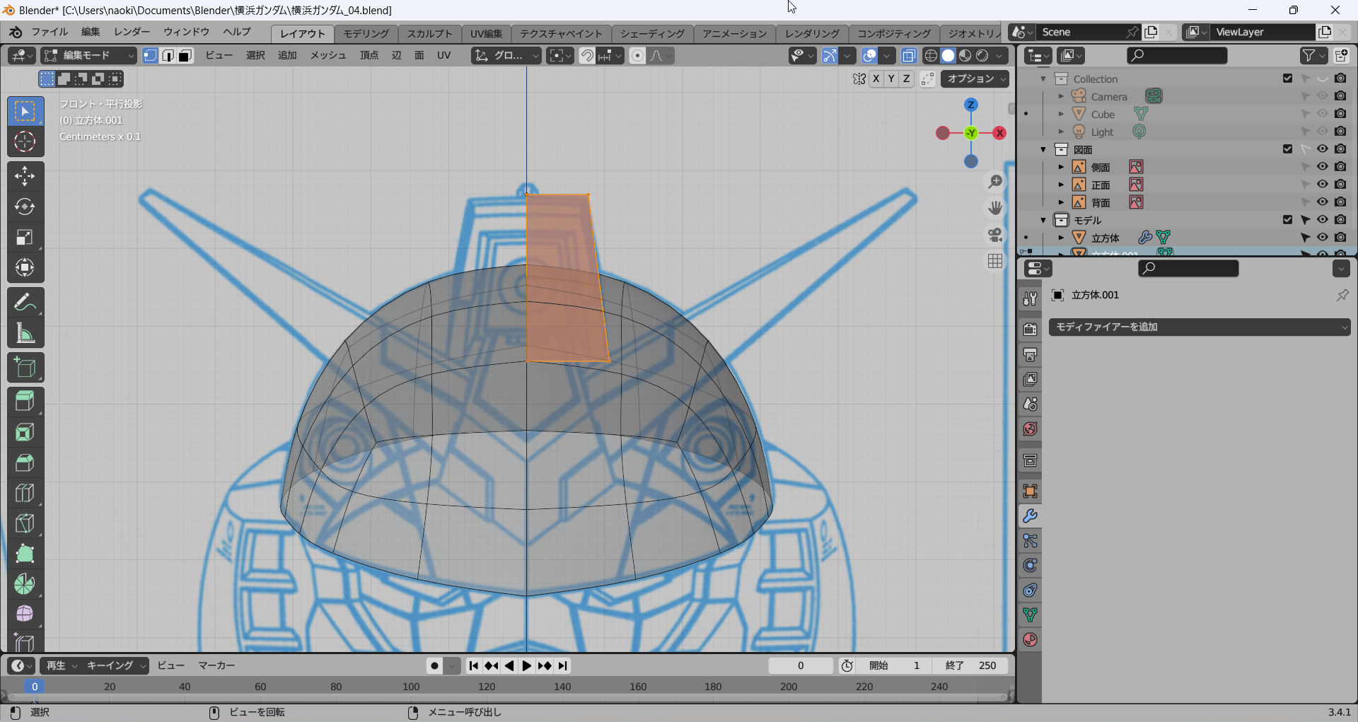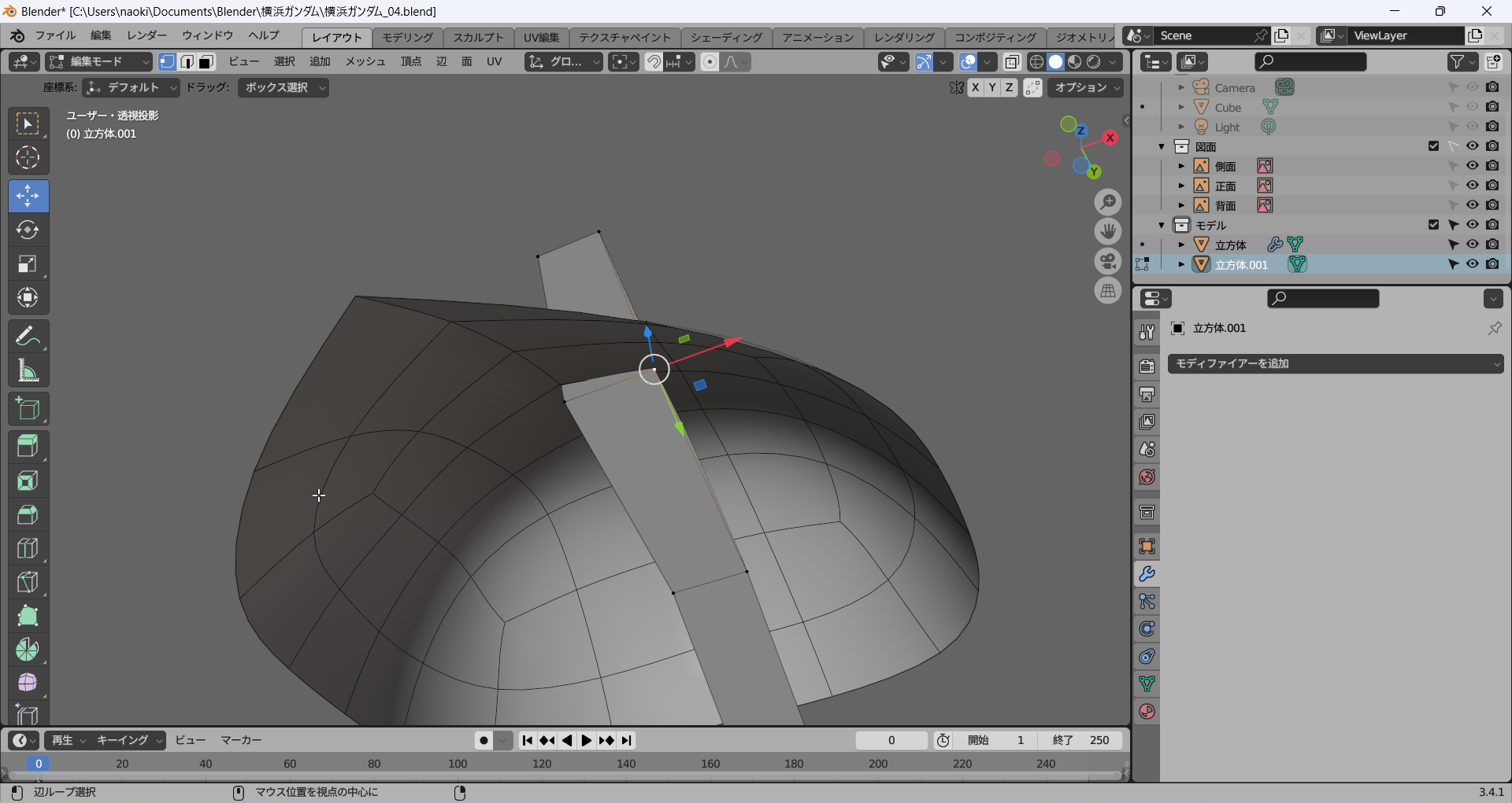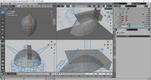 実際のとさかはコの字型の板で先端および終端のやや奥まった箇所に蓋がされているので次回はモディファイアーのソリッド化を使用して平面を板状に加工してみる。