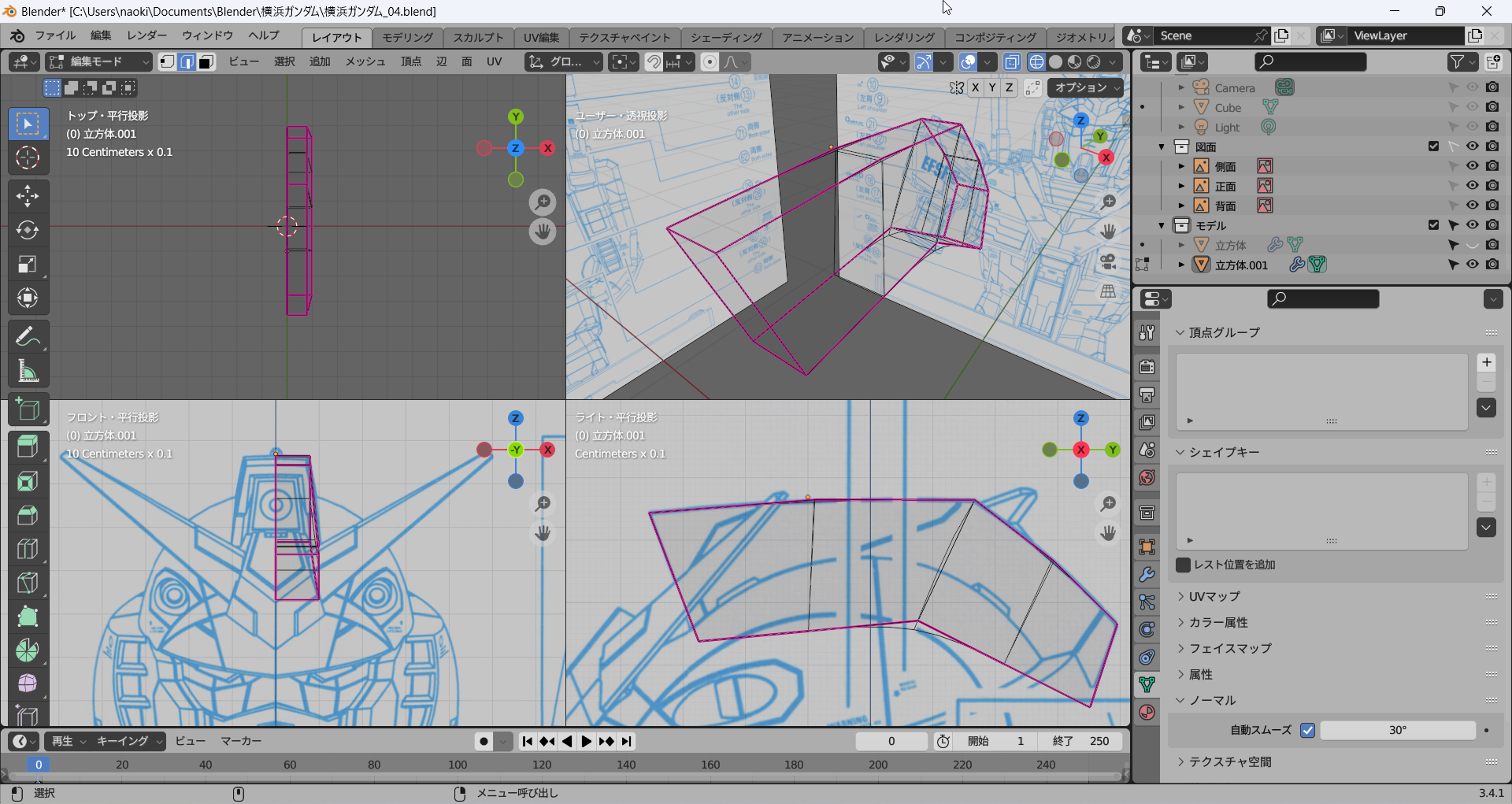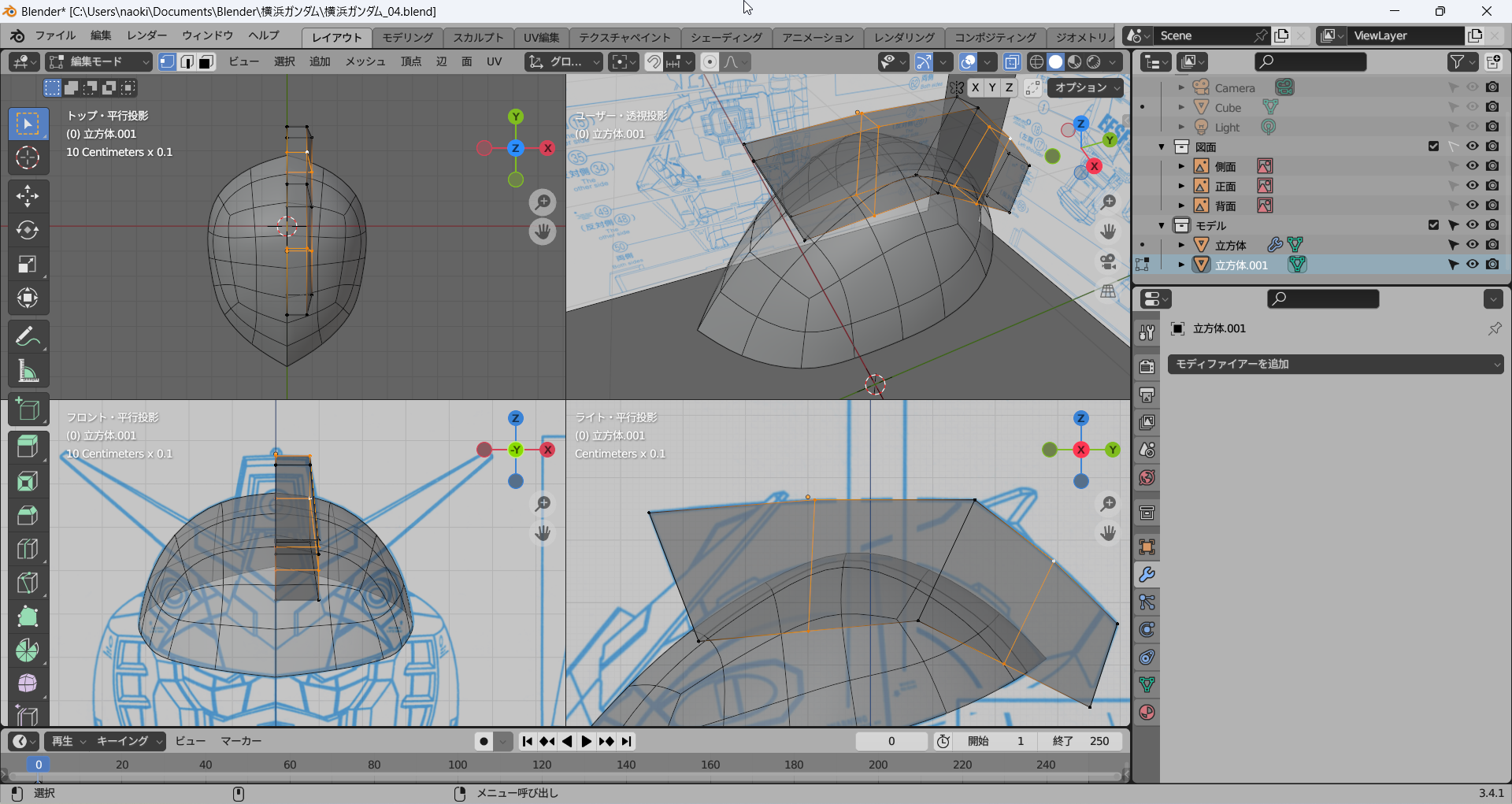 3DビューでCtrl+Alt+Qを押すと四面図表示になるので様々な角度から確認がしやすい。再度Ctrl+Alt+Qを押すと元に戻る。
