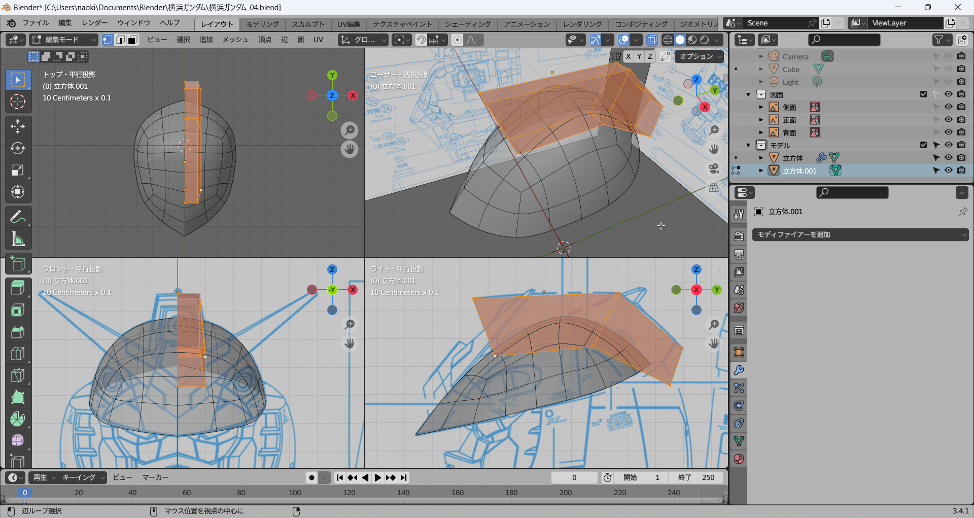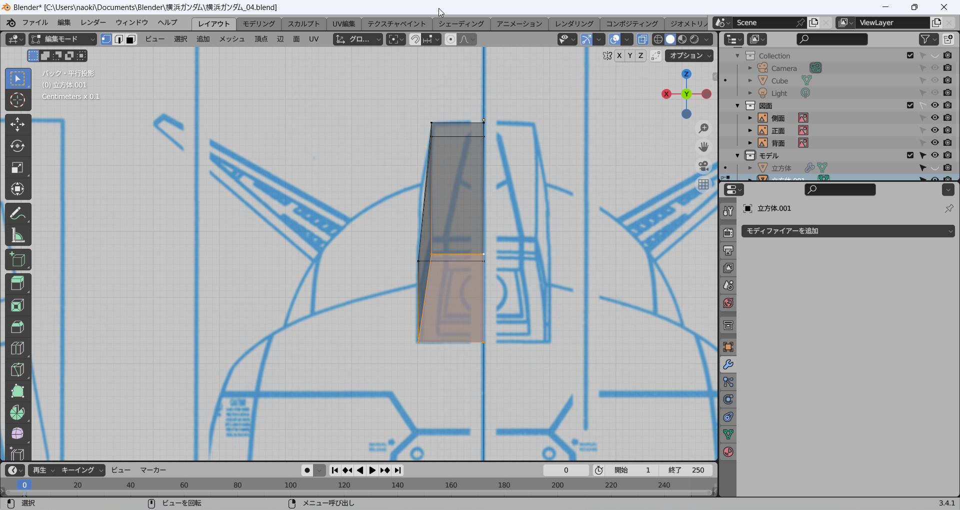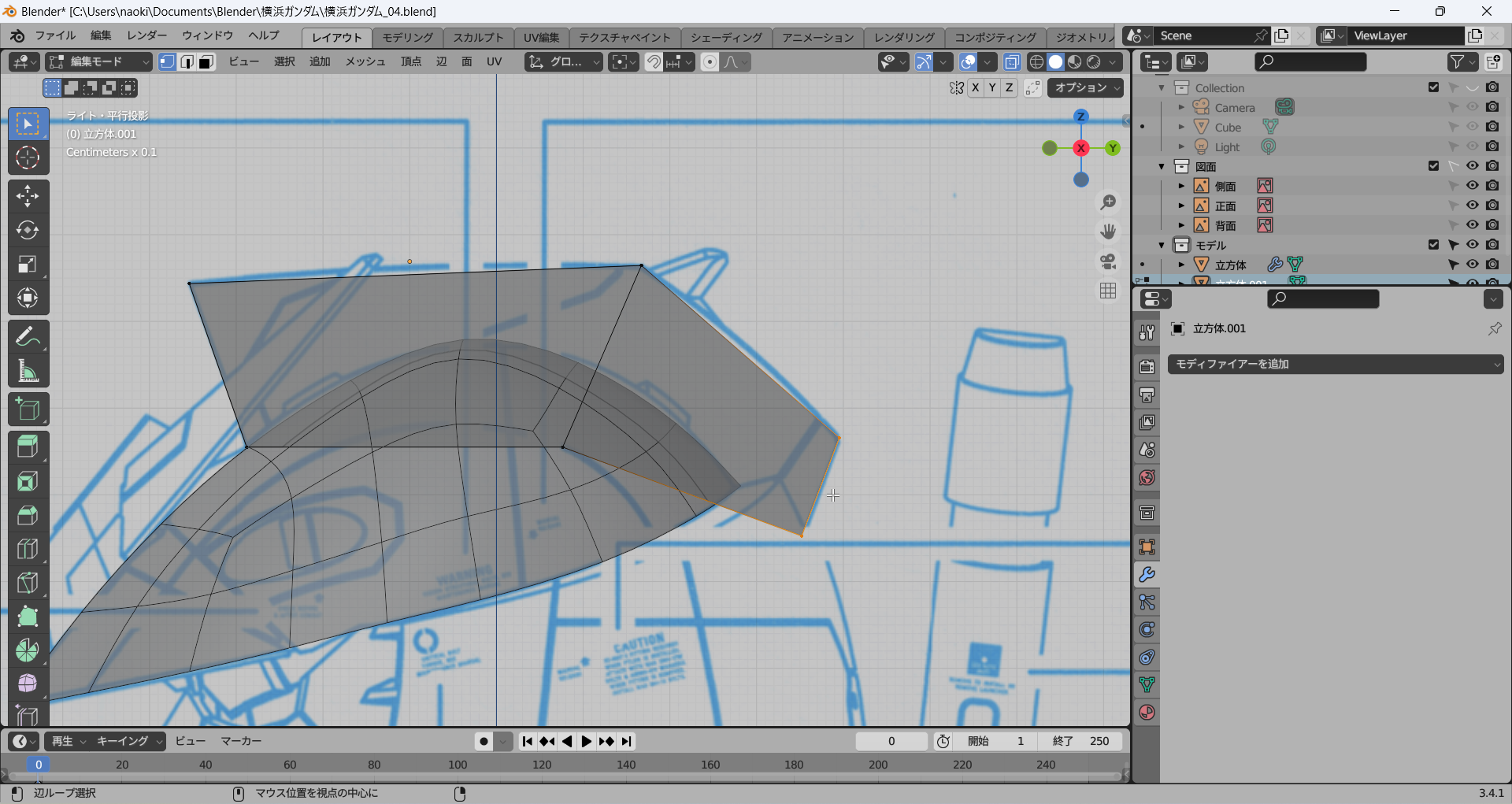 立方体を追加して正面からのビューで下絵に合わせて台形状に編集する。