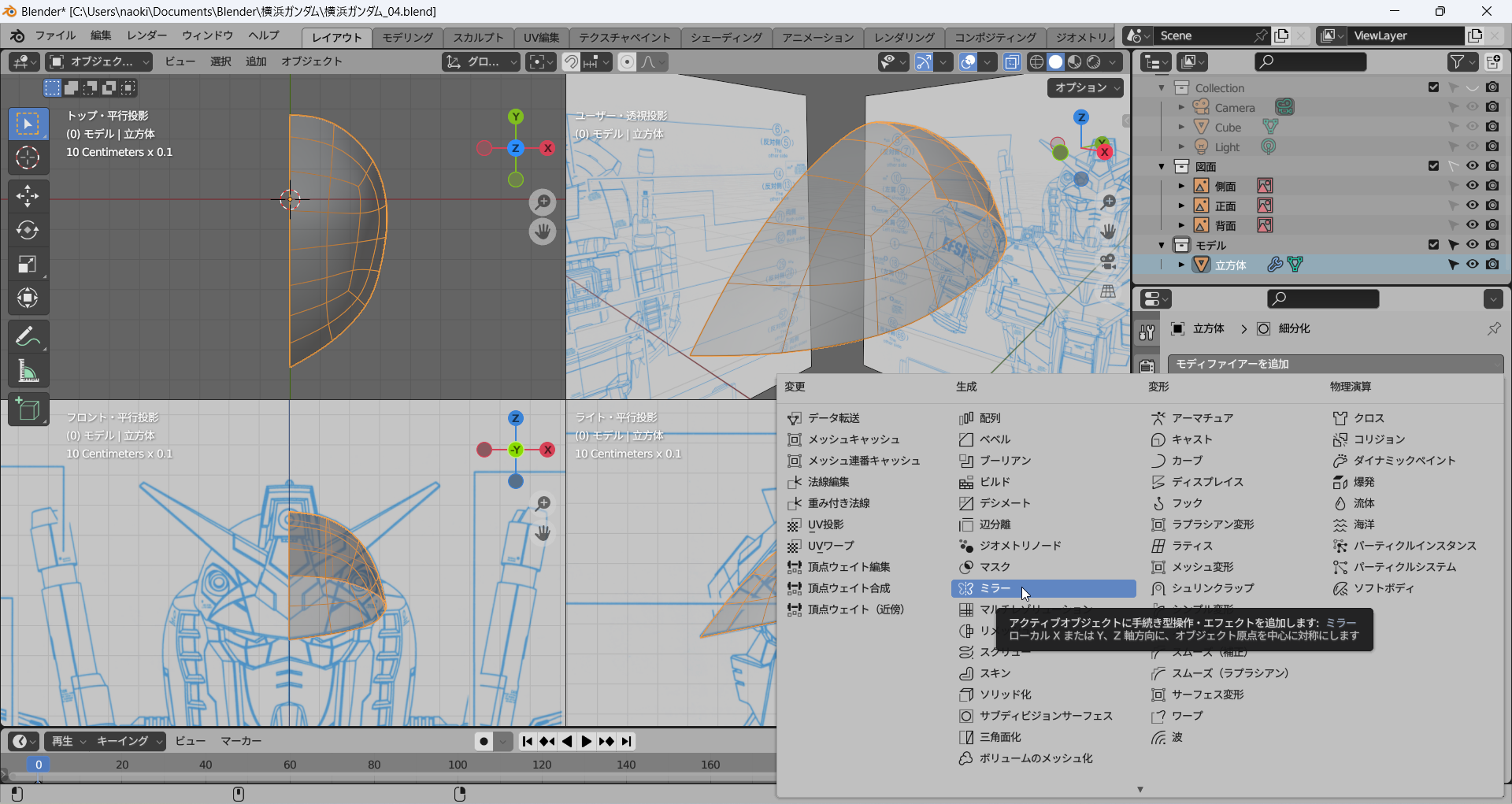帽子オブジェクトを選択してモディファイアープロパティで「モディファイアーを追加」をクリックし、ミラーをクリックする。