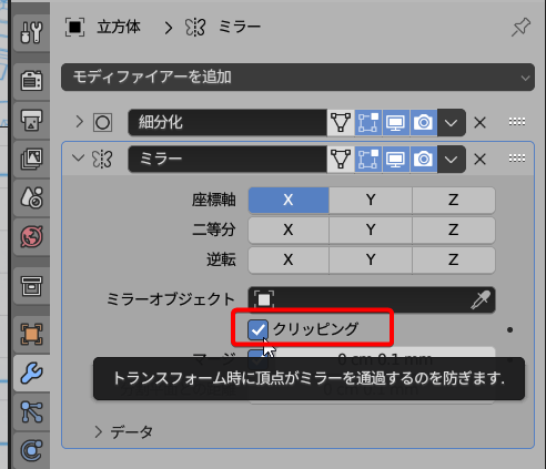 今回はX軸を中心として左右対称にミラーオブジェクトを表示するのでパラメータはデフォルトのままでよいが、クリッピングをONにしておけば頂点編集中にミラー側に頂点が移動しないようにクリッピングしてくれるので事故が防げる。