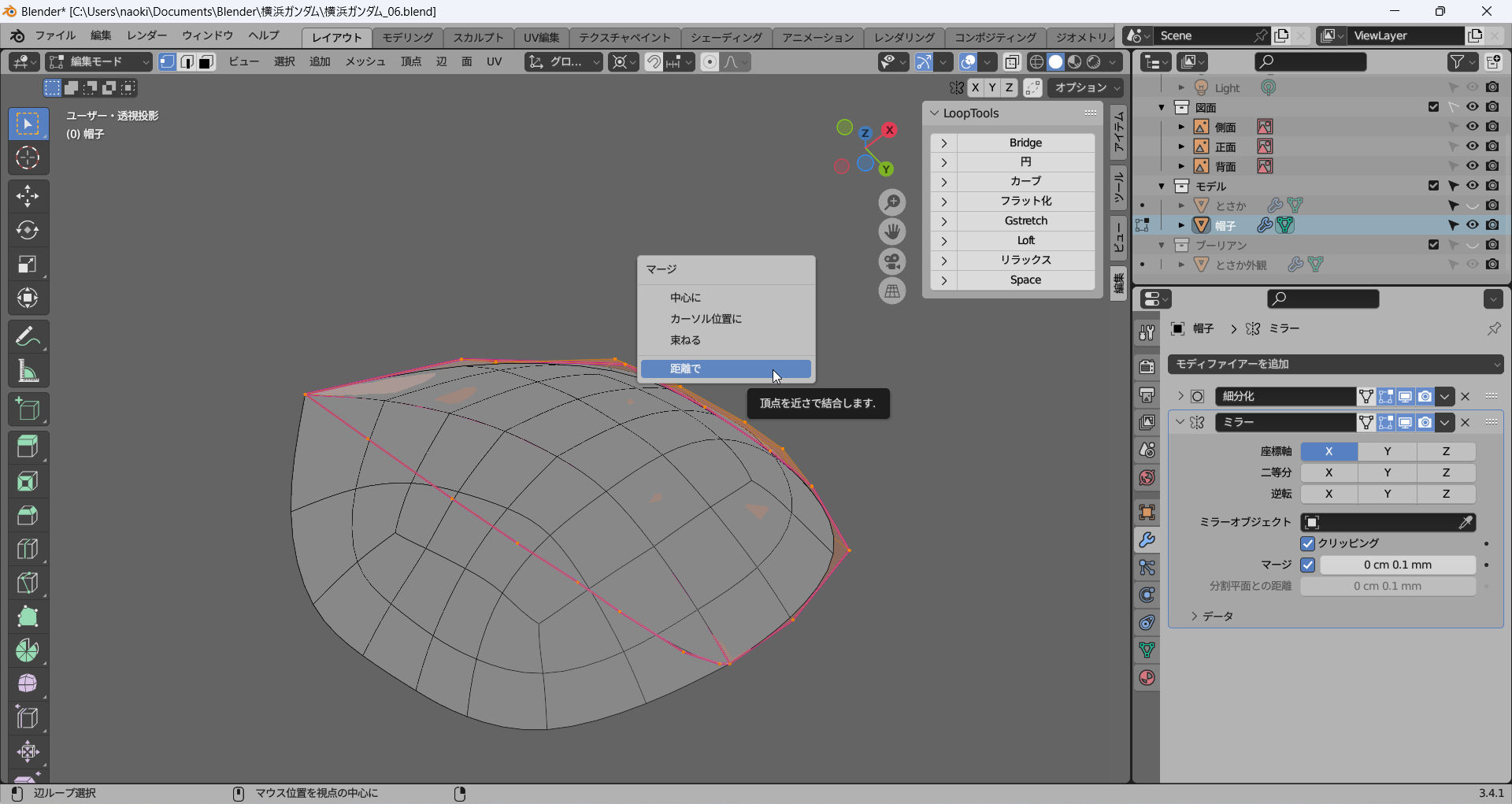 同一座標、もしくは極めて近い位置に頂点が重なると編集に思わぬ悪影響をあたえることがあるので(選択して移動したら移動元と移動先に頂点が表示される、など)マージしてしまう。
