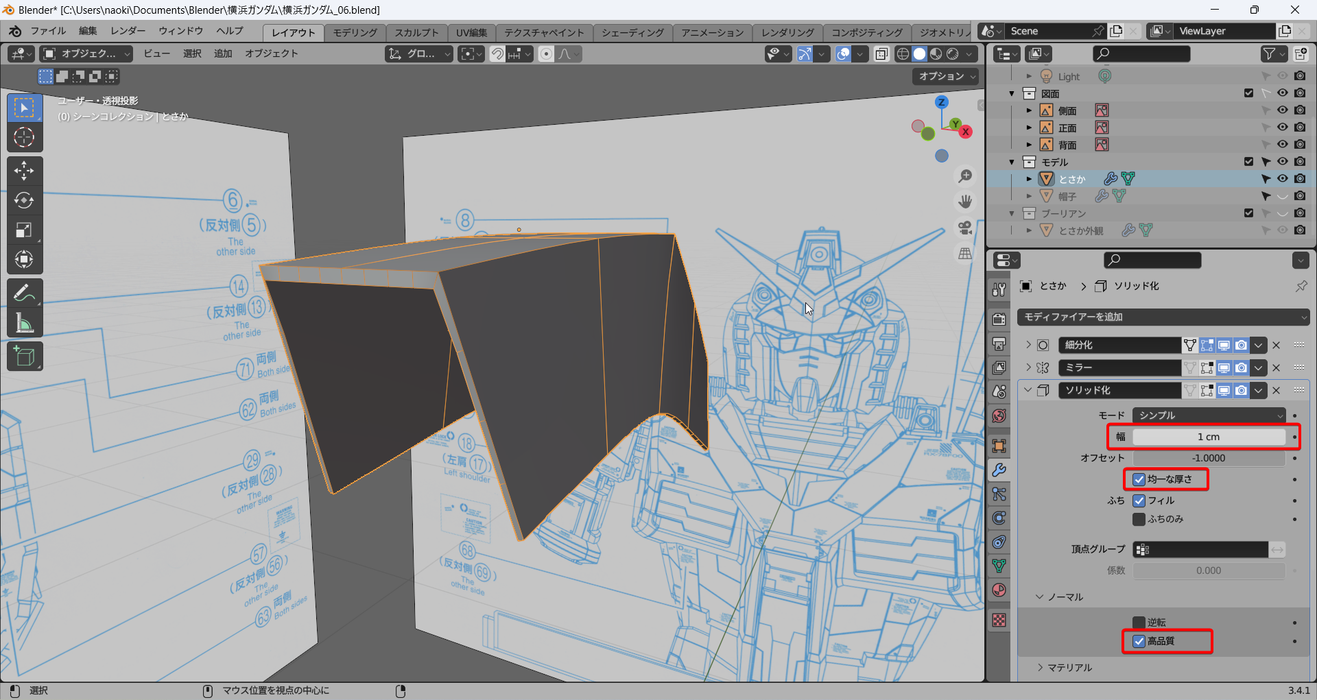 曲り角の厚みがおかしかったので赤枠をつけたパラメータ、「均一な厚さ」と「ノーマル」-「高品質」をONにした。