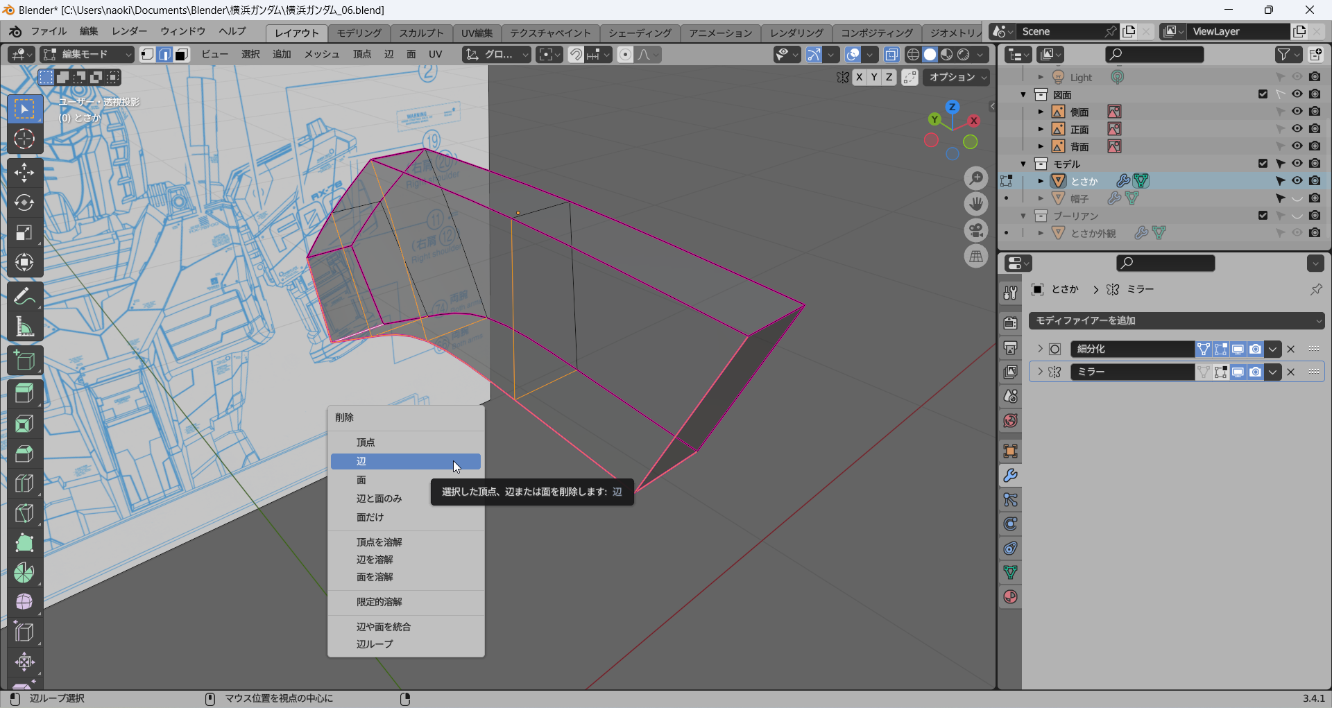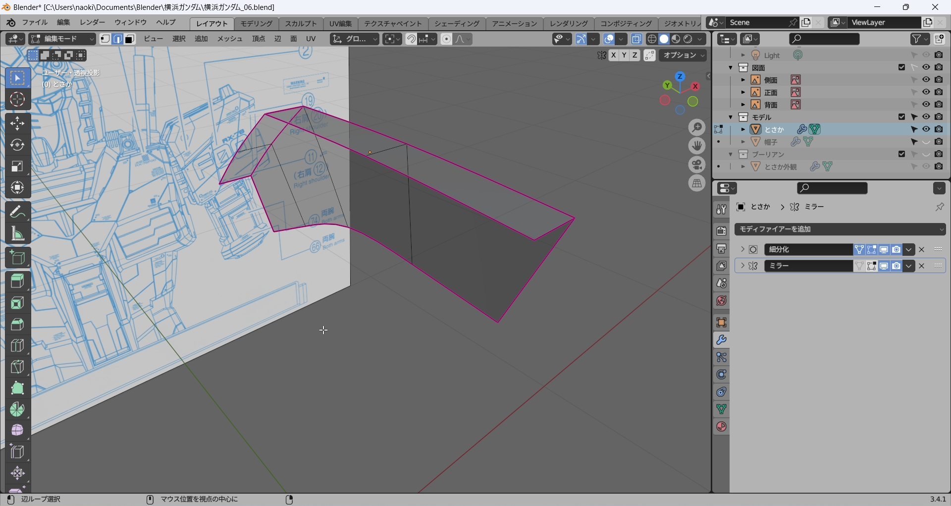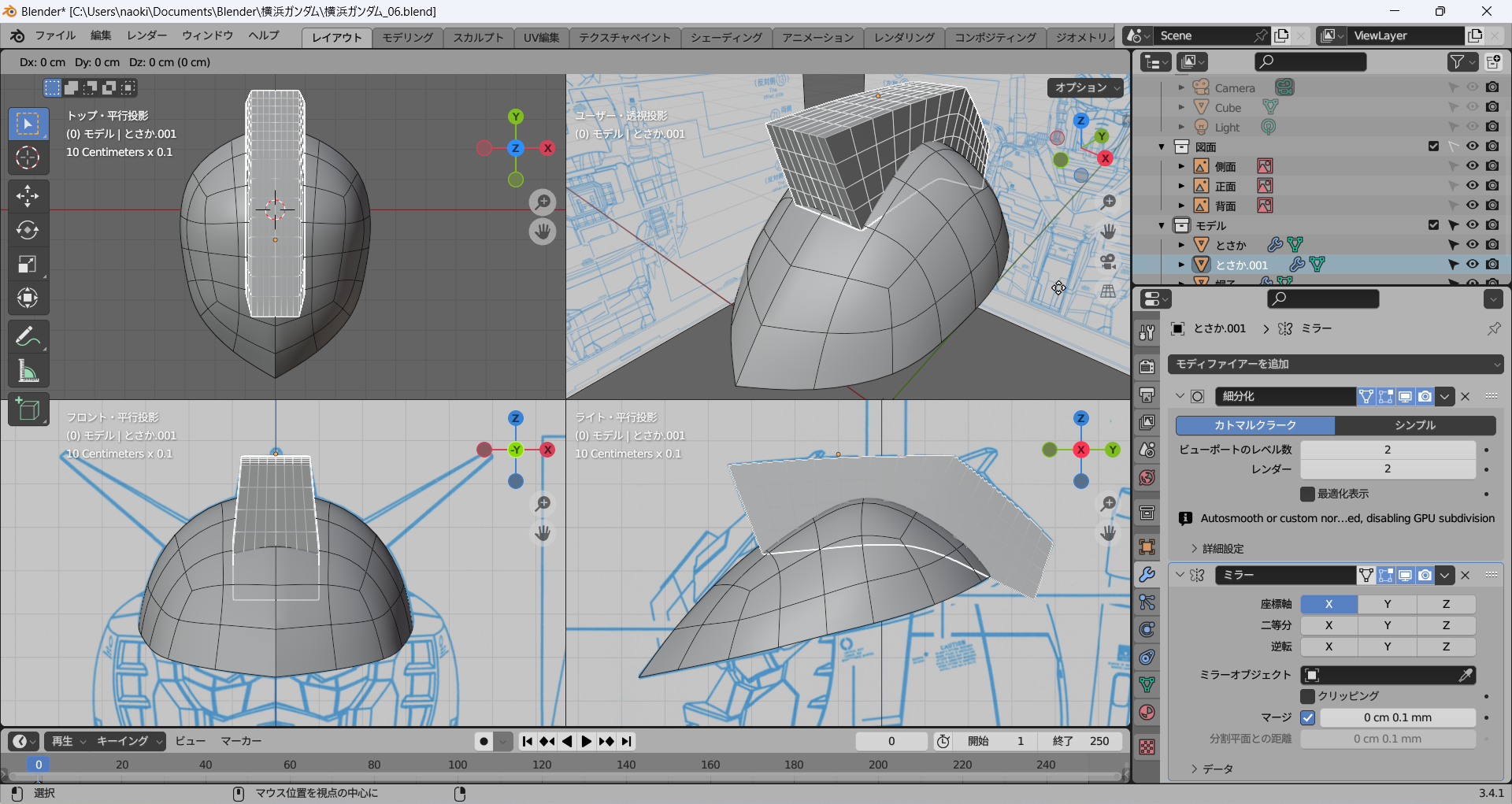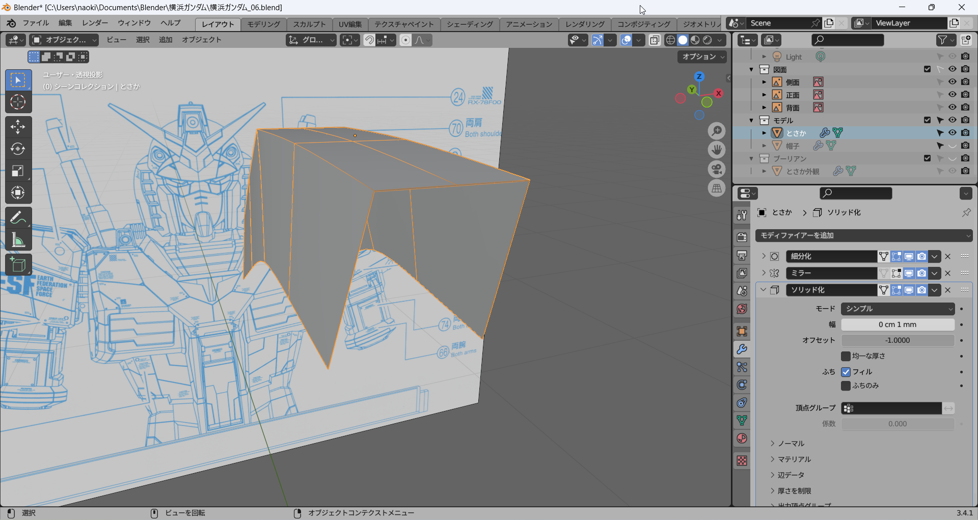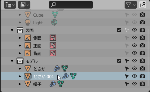 アウトライナーを確認するとモデルコレクションにとさか.001が追加されていることを確認できる。