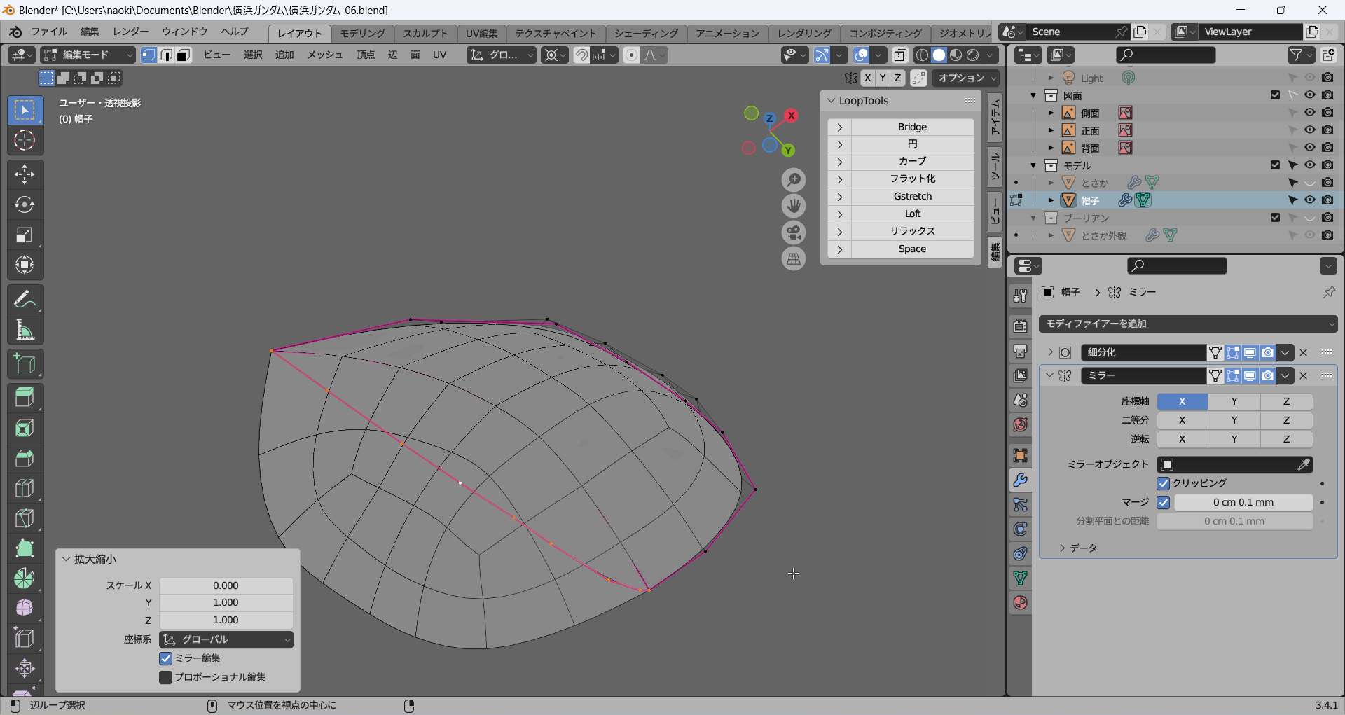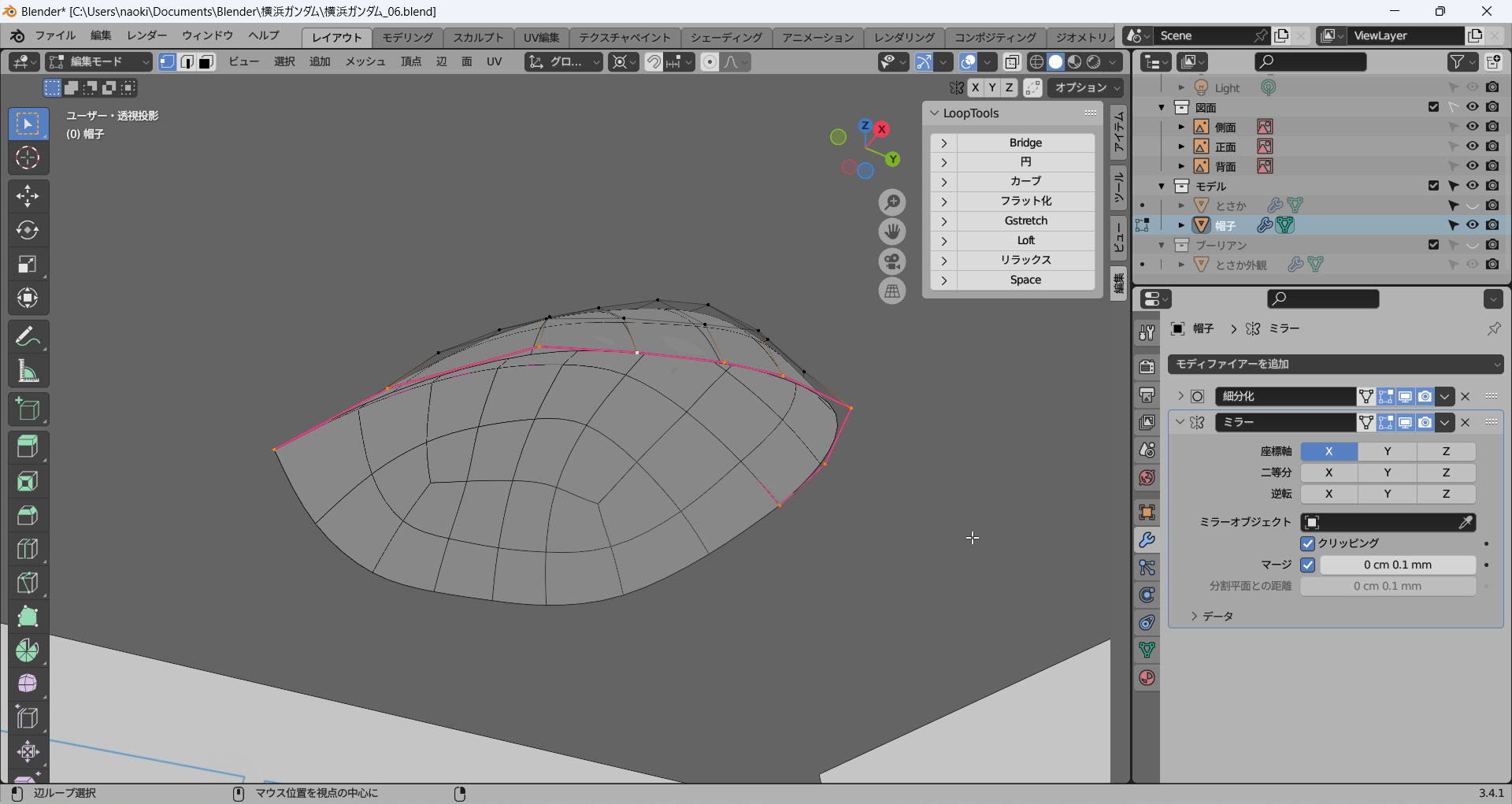 編集モードで頂点選択モードにして帽子の下辺あたりをAlt+左クリックして下辺の頂点を選択する。