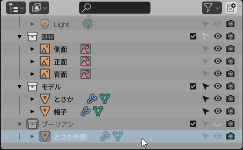 後工程で帽子をくりぬくときに使用するので新たにブーリアンというコレクションを作成してそこに移動し、邪魔にならないようにブーリアンコレクションは非表示にしておく。