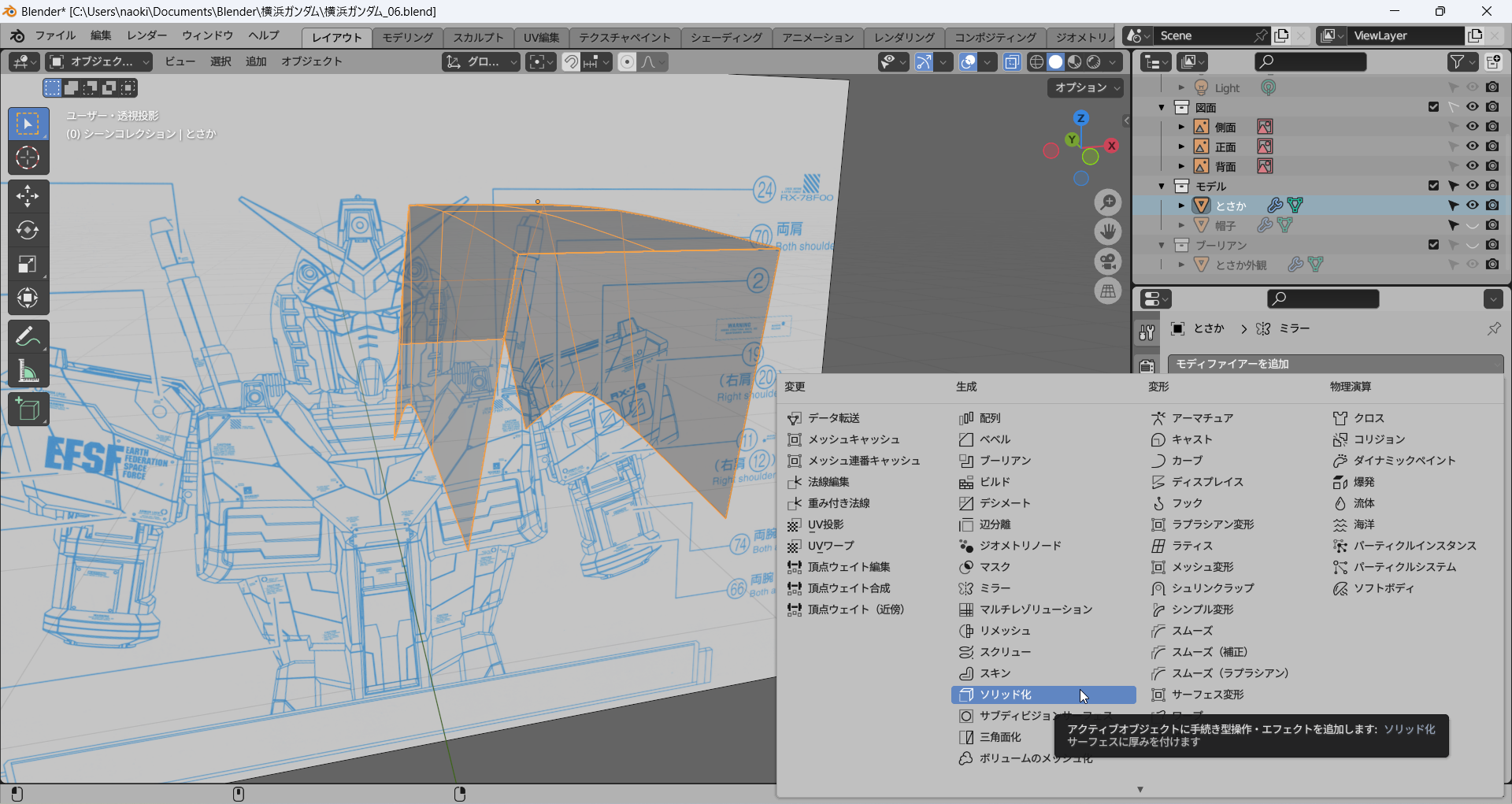 削除したらオブジェクトモードにしてモディファイアープロパティでモディファイアーを追加-ソリッド化をクリックする。