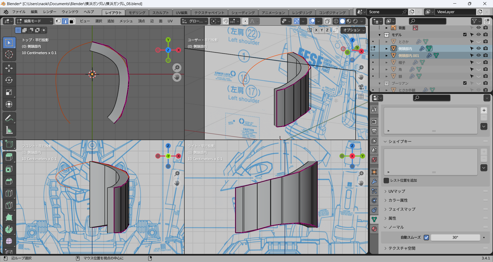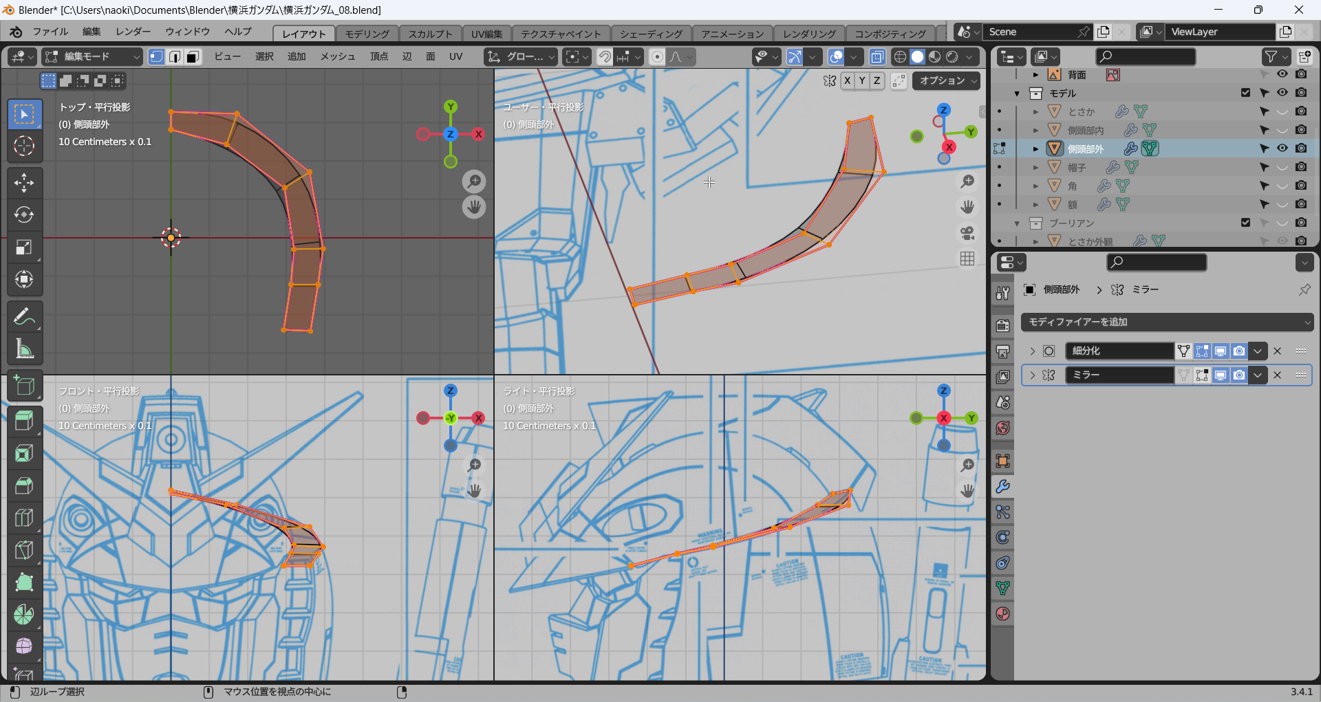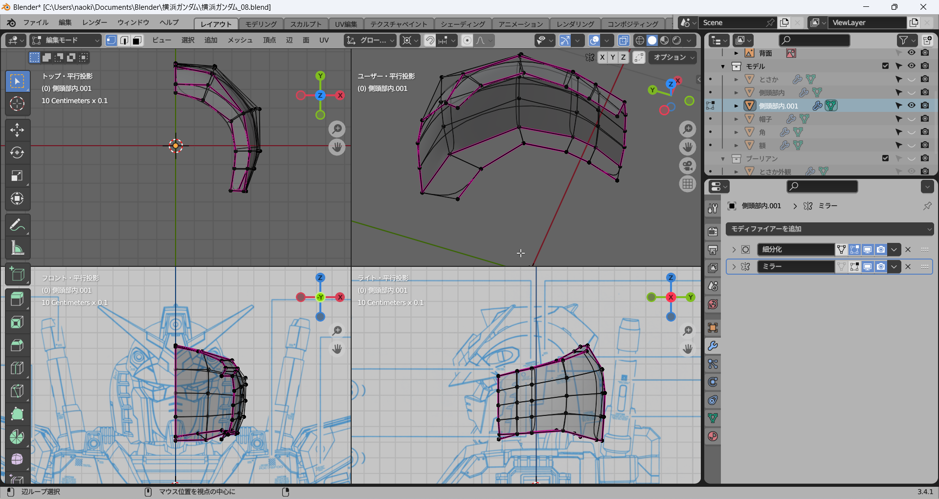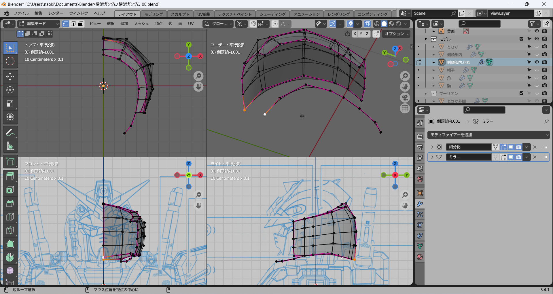 正面および側面からのビューで一番外側の辺を下絵に沿って修正し、その間はそれに合わせてなんとなく頑張る。メッシュ分析がここでも役立つ。