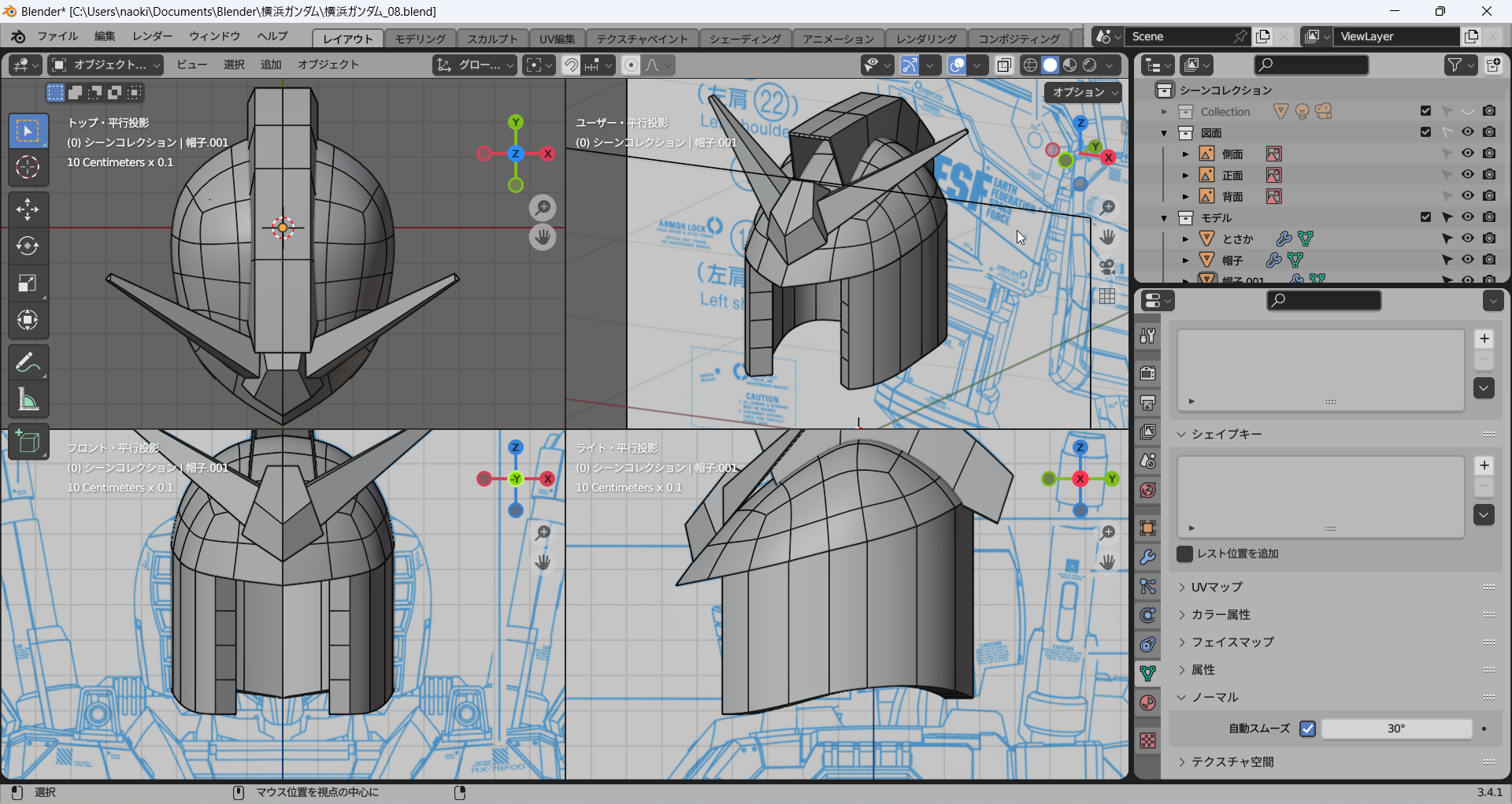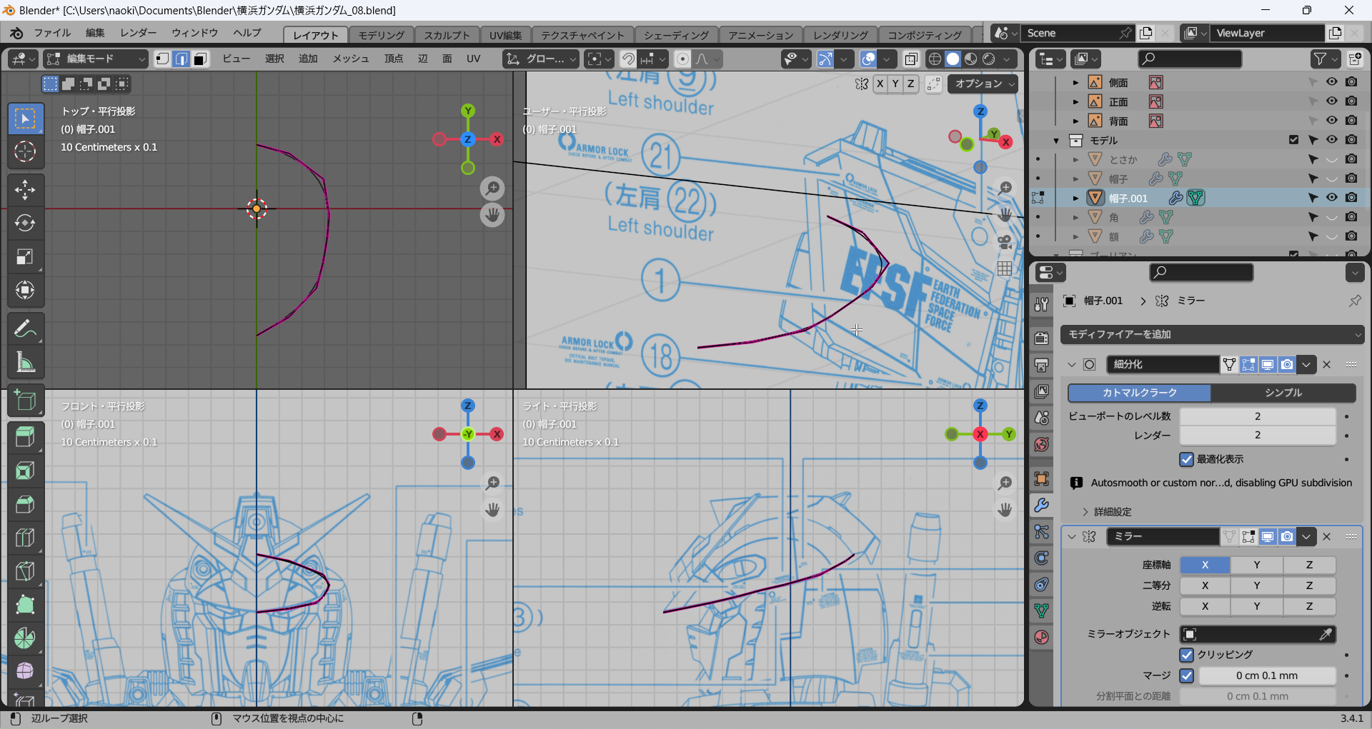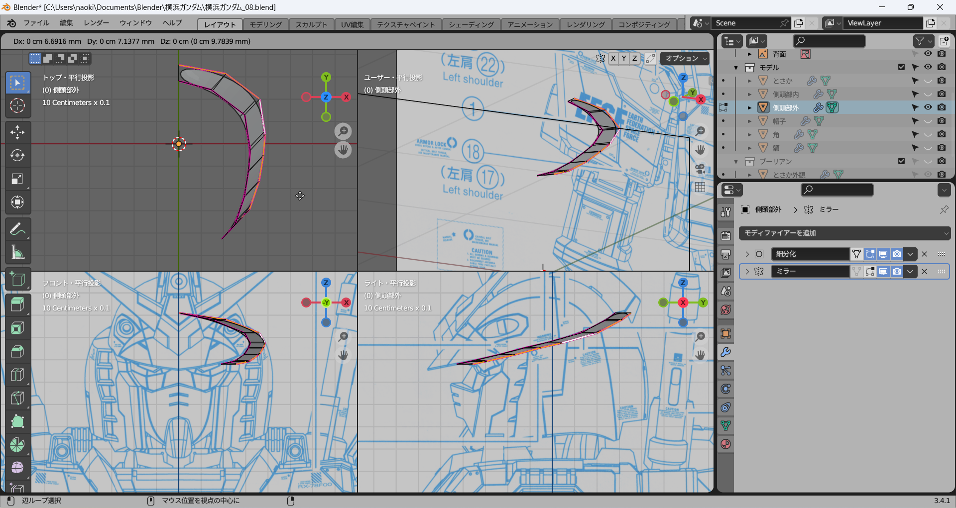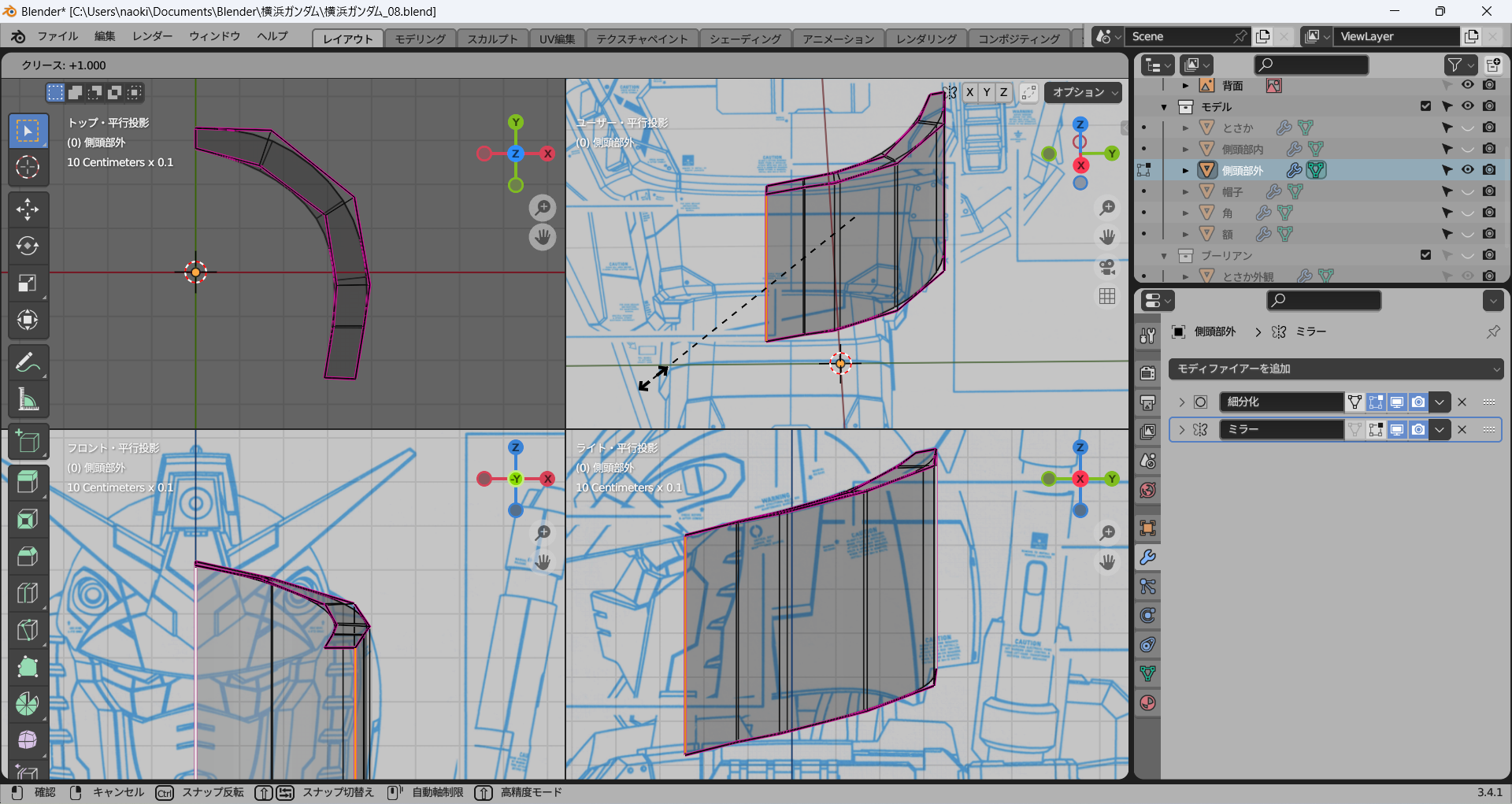 正面および側面からのビューで一番外側の辺を下絵に沿って修正し、その間はそれに合わせてなんとなく頑張る。メッシュ分析がここでも役立つ。