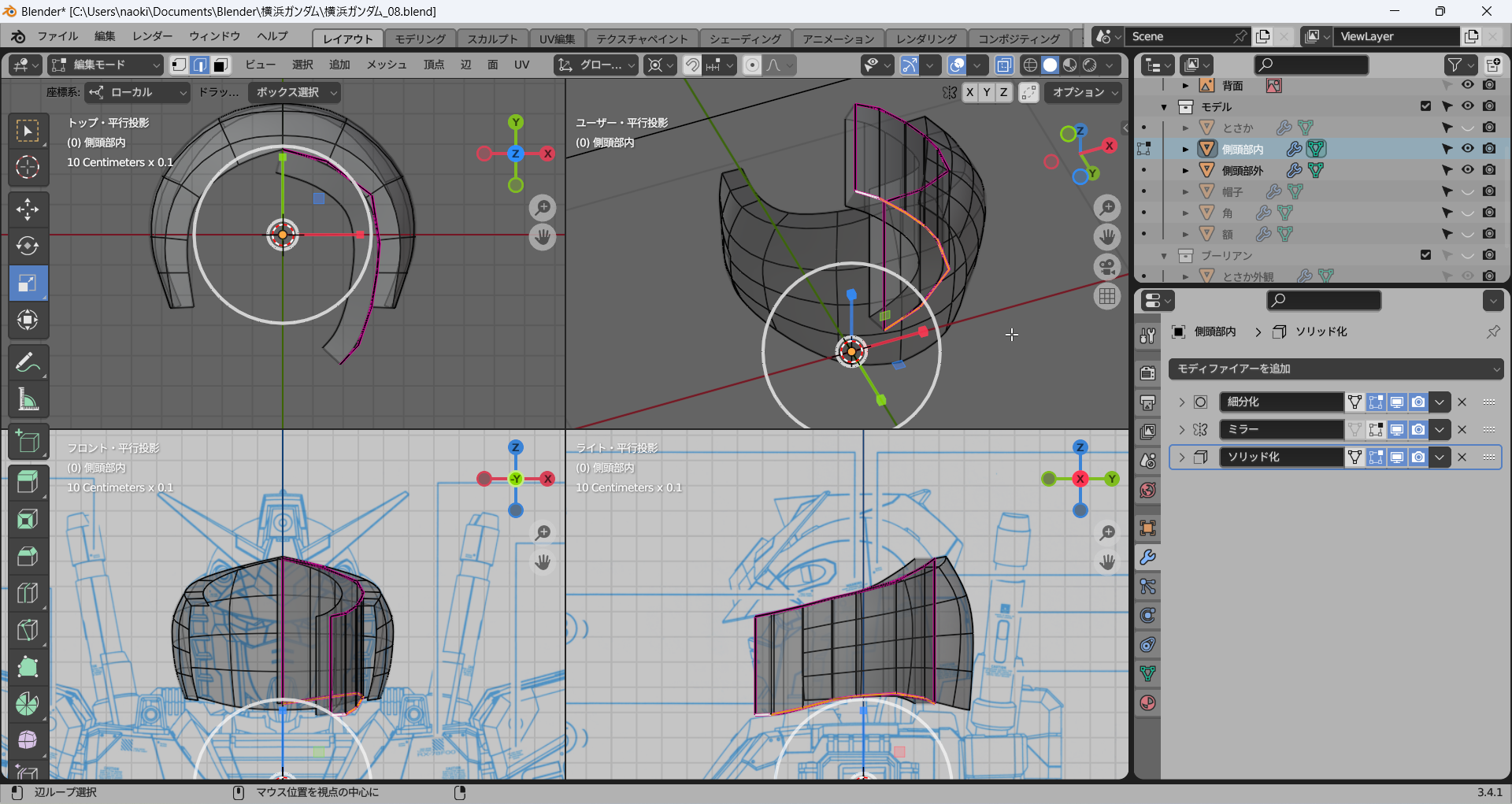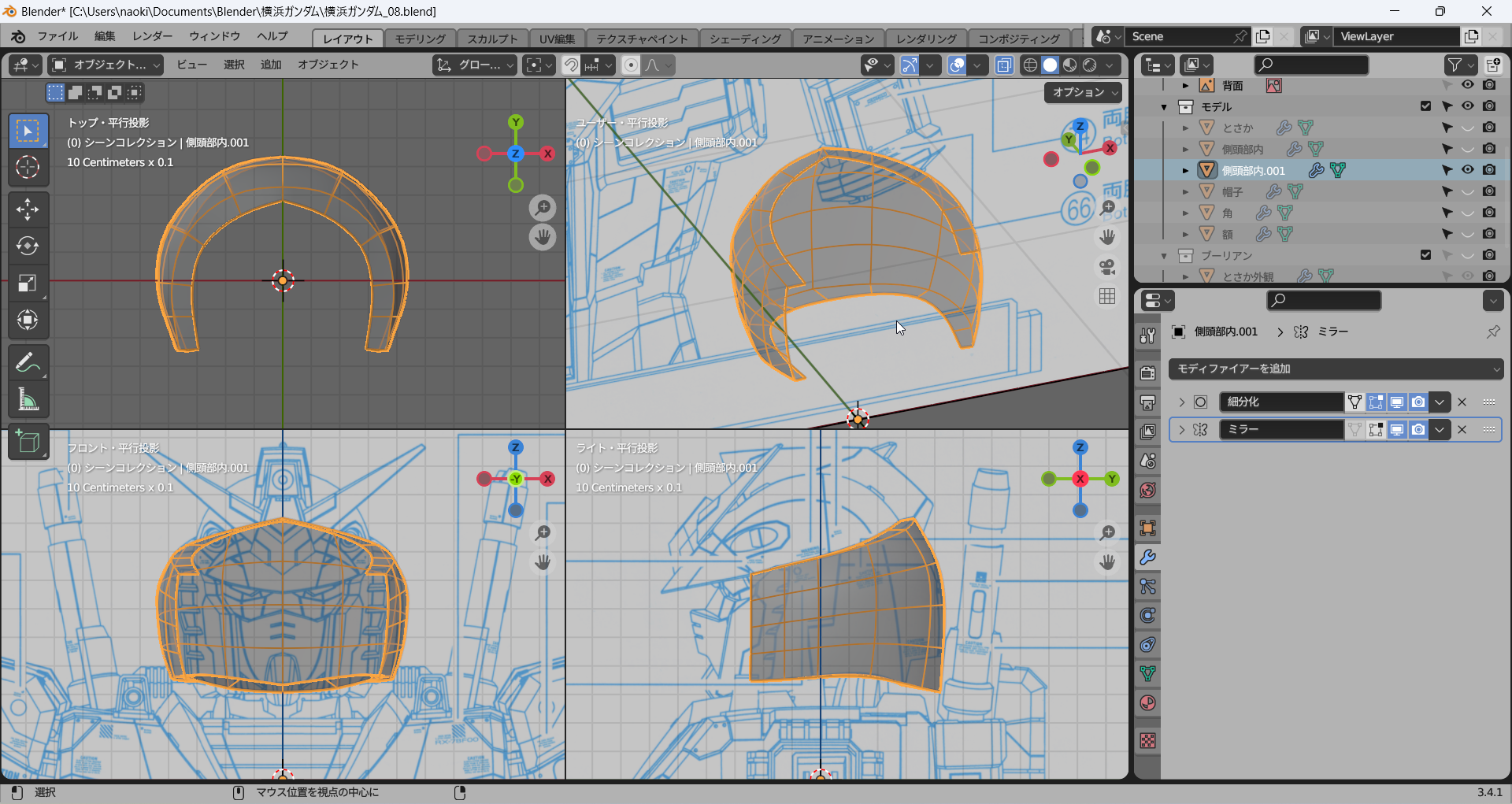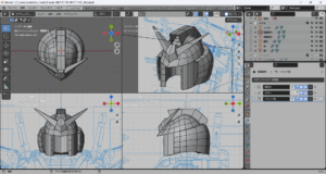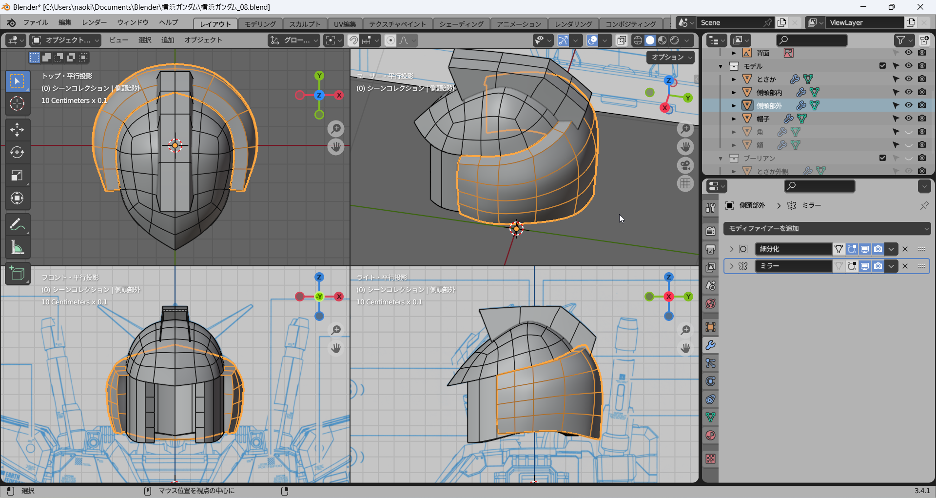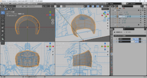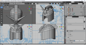 これまでに作成したパーツをすべて表示してみた。かっちょわるい。中世の騎士(モブ)がかぶっていそうな兜にしか見えない。これはモデリングを加速しなければならない。