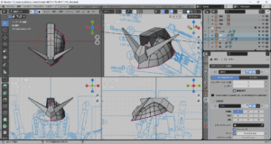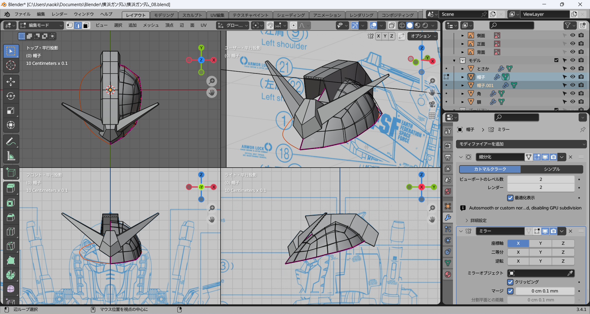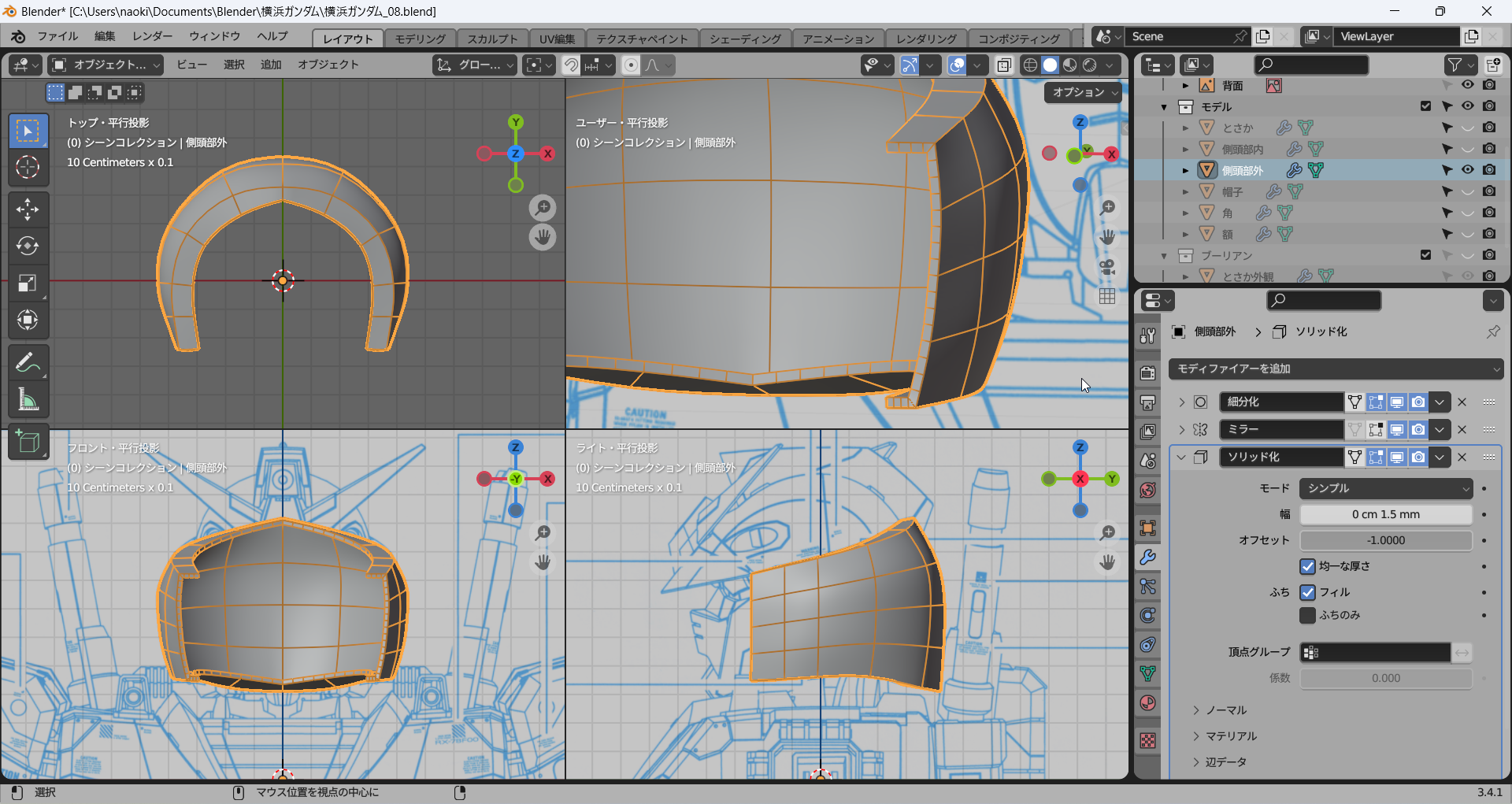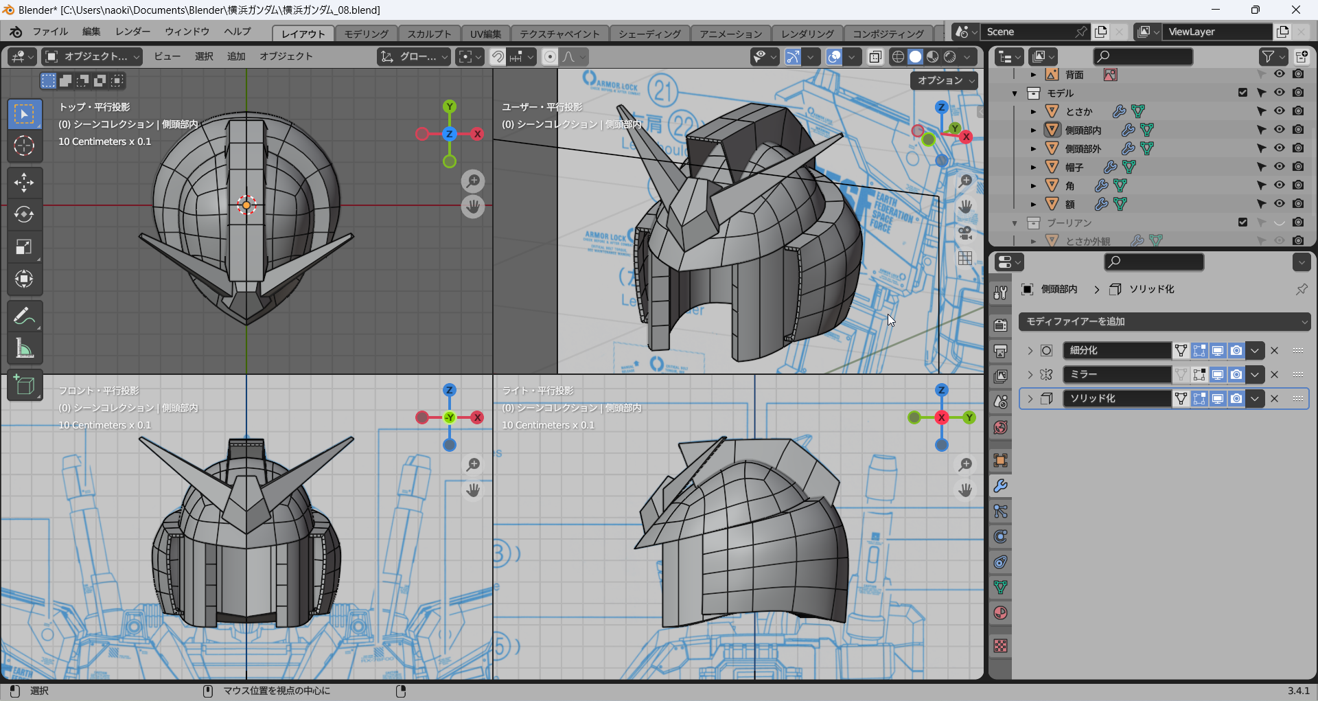 これまでに作成したパーツをすべて表示してみた。かっちょわるい。中世の騎士(モブ)がかぶっていそうな兜にしか見えない。これはモデリングを加速しなければならない。