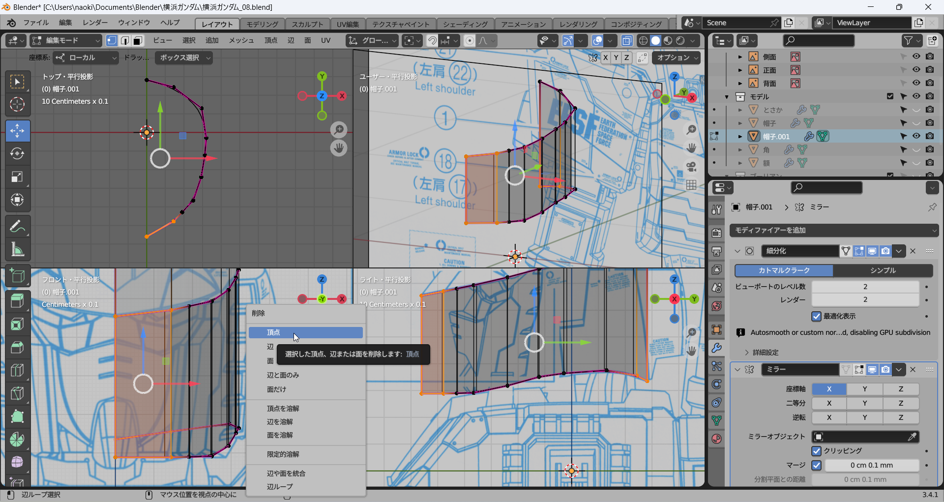 側面の下絵に沿って頂点をそろえる。このままだと顔がすべて覆われてしまうので前面の頂点を削除する。