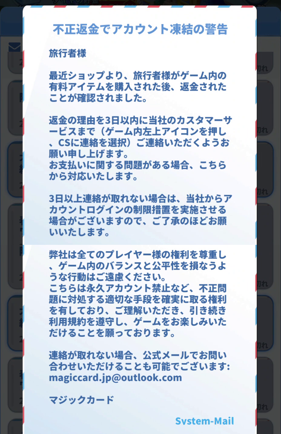 共産主義国家の闇を感じた。サードパーティ決算会社から4999ルビーを4セット購入して一か月後に一回目の警告。4セット購入してそのうち1セットについて不正返金がされたと連絡があったのが購入して一か月後。