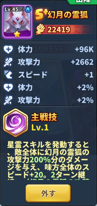 最近実装された星霊は狐さんを使っています。敵全体にダメージを与えるので狐が発動するとダフネ流血が敵全員に1スタック確定です。さらにスピードの底上げ。イケメソ。