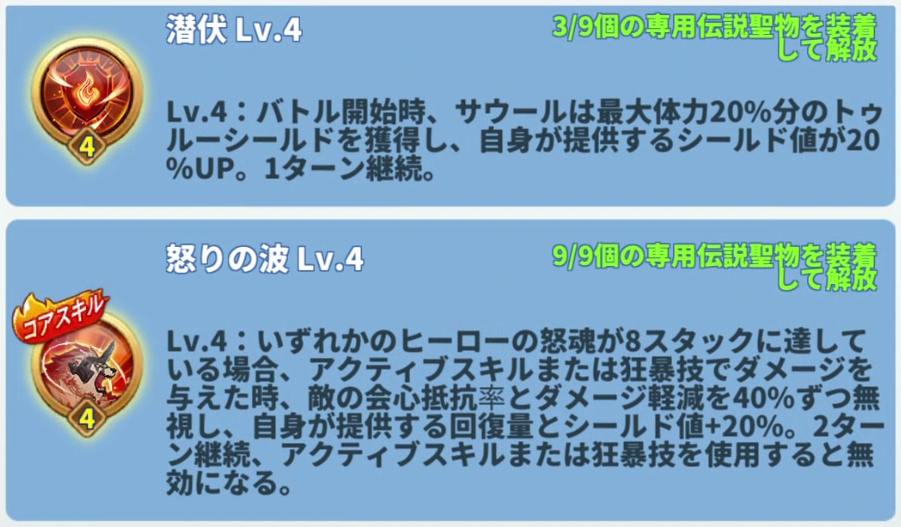 サウールは専用31聖物3でよいのか?そりゃ、タンクなのでステータスは強いに越したことはありません。なので最終的にはいくところまで行くのでしょうけど、ここでは能力的に必須な能力かそうでないのかを考えてみます。