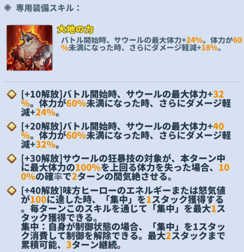 専用30で制御能力を獲得する。最大体力の100%を上回ったときに100%の確率で2ターン気絶させる。最大体力の100%を上回ったって死んでるがな。回復や致死回避でしのいだ場合は気絶させるという話だと思いますが、最近は制御解除も増えてきたので能力的にはおまけかなという感じです。タンクは1ターンで最大体力の100%なんて削れないしダメージディーラーは制御無効か自力解除もってるキャラが多いし。古参ダメージディーラー相手でかつ制御対処をしていないという状況でのみ効果がある能力ですね。